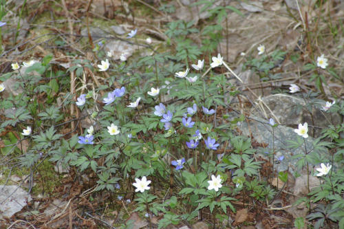 Ovanligt med vitsippor och blåsippor på samma plats.